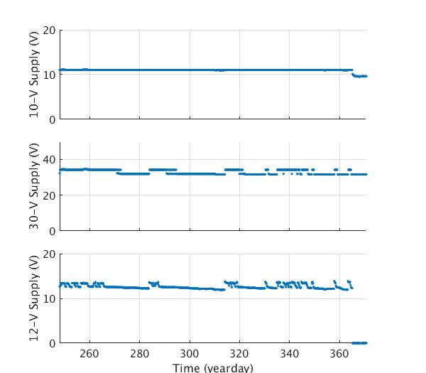 Engineering data plots for AOFB 10: 10-V Supply (top panel), 12-V wind generator battery voltage (second panel) and 40-V Voltage supply (bottom panel)