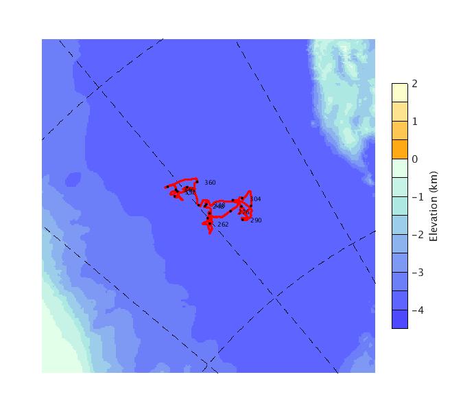 Map of AOFB 10 drift trajectory. Black dots on the map indicate biweekly positions labeled with corresponding yearday values.