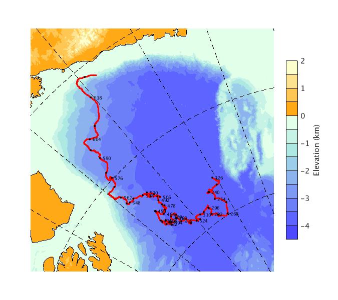 Map of AOFB 12 drift trajectory. Black dots on the map indicate biweekly positions labeled with corresponding yearday values.