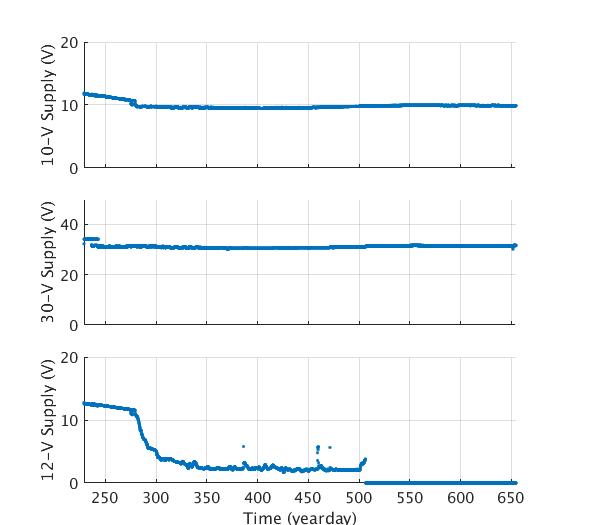 Engineering data plots for AOFB 13: 10-V Supply (top panel), 12-V wind generator battery voltage (second panel) and 40-V Voltage supply (bottom panel)