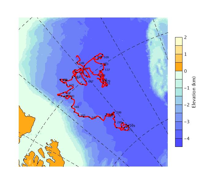 Map of AOFB 13 drift trajectory. Black dots on the map indicate biweekly positions labeled with corresponding yearday values.