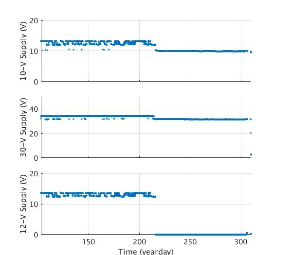 Engineering data plots for AOFB 18: 10-V Supply (top panel), 12-V wind generator battery voltage (second panel) and 40-V Voltage supply (bottom panel)