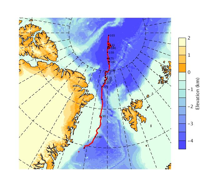 Map of AOFB 18 drift trajectory. Black dots on the map indicate biweekly positions labeled with corresponding yearday values.