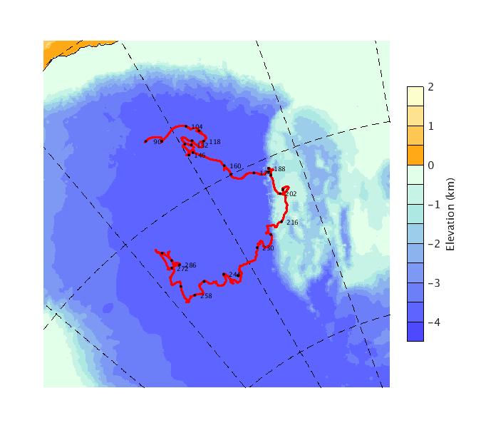 Map of AOFB 19 drift trajectory. Black dots on the map indicate biweekly positions labeled with corresponding yearday values.