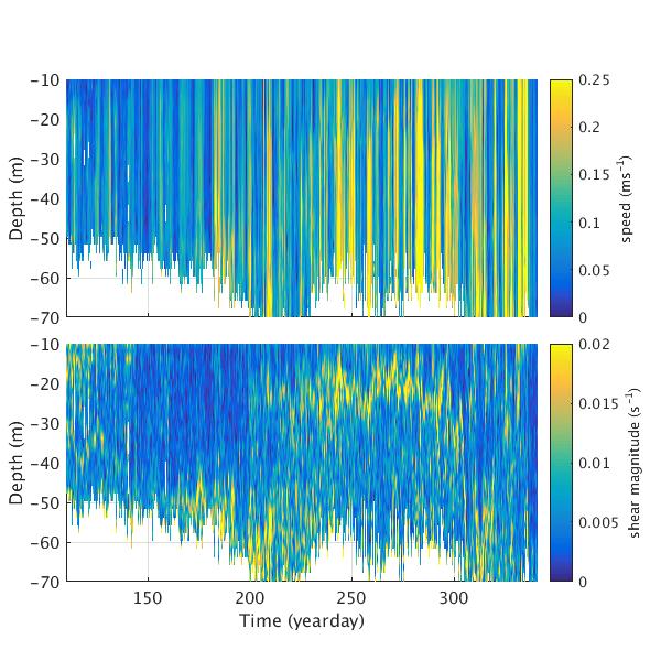 Time-series plots for AOFB 20 ADCP: speed relative to moving ice (top panel) and magnitude of vector shear (bottom panel)