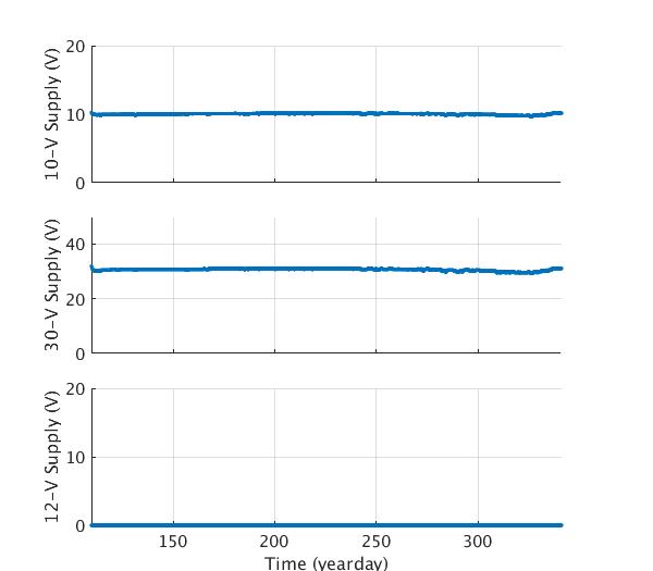 Engineering data plots for AOFB 20: 10-V Supply (top panel), 12-V wind generator battery voltage (second panel) and 40-V Voltage supply (bottom panel)