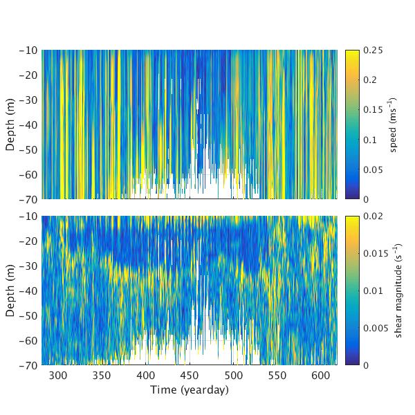 Time-series plots for AOFB 21 ADCP: speed relative to moving ice (top panel) and magnitude of vector shear (bottom panel)