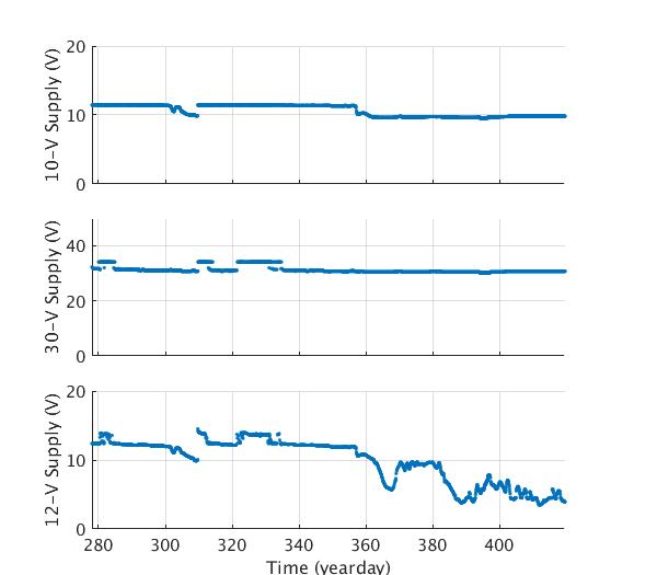 Engineering data plots for AOFB 22: 10-V Supply (top panel), 12-V wind generator battery voltage (second panel) and 40-V Voltage supply (bottom panel)