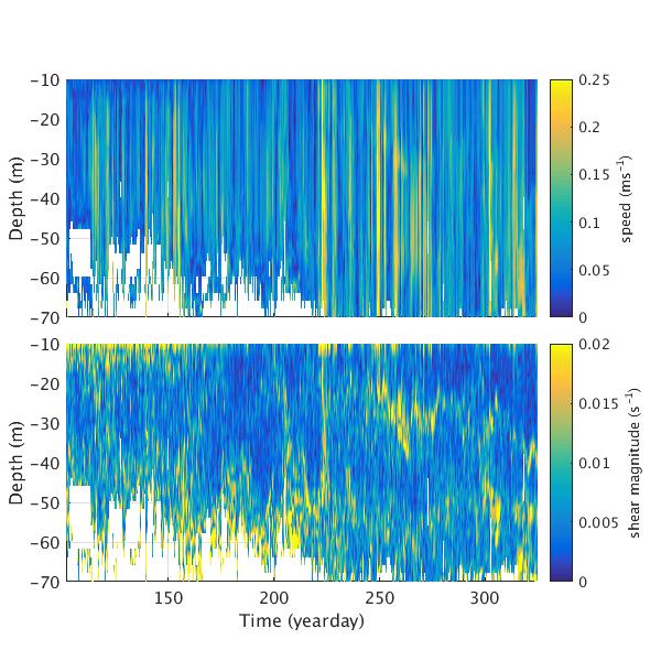 Time-series plots for AOFB 23 ADCP: speed relative to moving ice (top panel) and magnitude of vector shear (bottom panel)