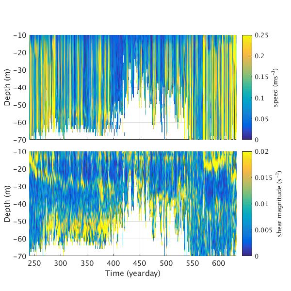 Time-series plots for AOFB 24 ADCP: speed relative to moving ice (top panel) and magnitude of vector shear (bottom panel)