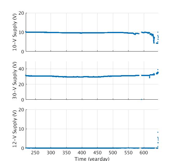 Engineering data plots for AOFB 25: 10-V Supply (top panel), 12-V wind generator battery voltage (second panel) and 40-V Voltage supply (bottom panel)