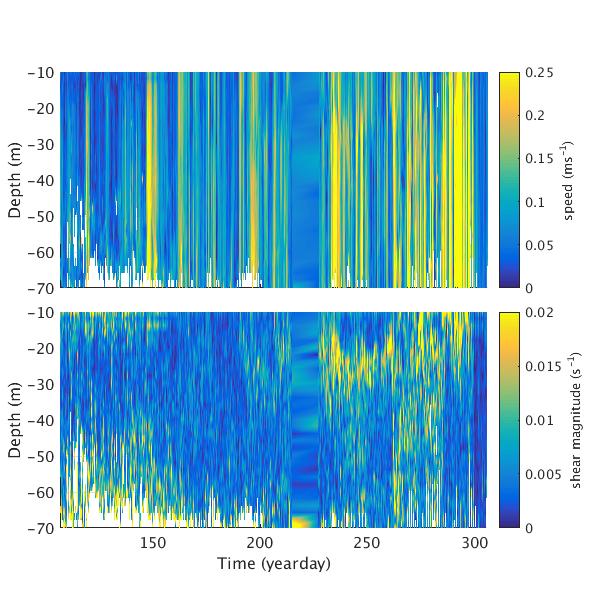 Time-series plots for AOFB 26 ADCP: speed relative to moving ice (top panel) and magnitude of vector shear (bottom panel)