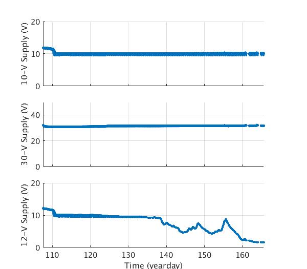 Engineering data plots for AOFB 28: 10-V Supply (top panel), 12-V wind generator battery voltage (second panel) and 40-V Voltage supply (bottom panel)