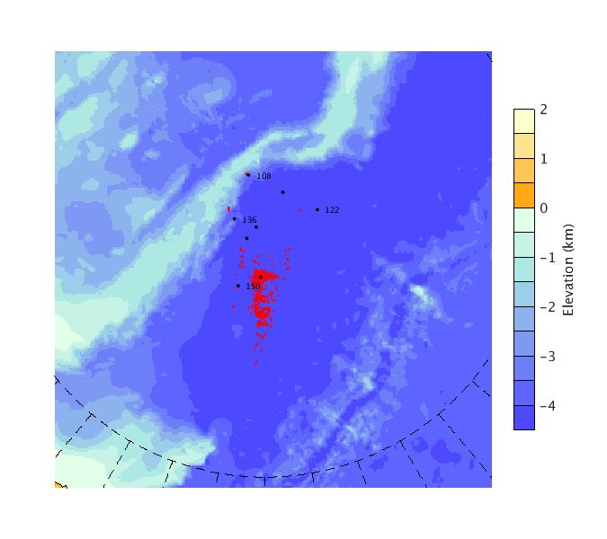 Map of AOFB 28 drift trajectory. Black dots on the map indicate biweekly positions labeled with corresponding yearday values.
