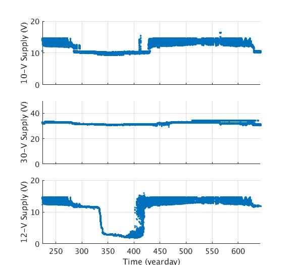 Engineering data plots for AOFB 29: 10-V Supply (top panel), 12-V wind generator battery voltage (second panel) and 40-V Voltage supply (bottom panel)