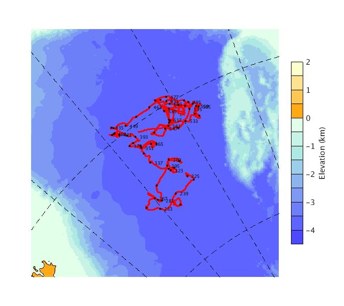 Map of AOFB 29 drift trajectory. Black dots on the map indicate biweekly positions labeled with corresponding yearday values.