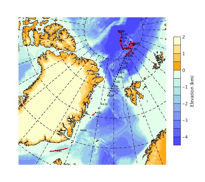 Map of AOFB 2 drift trajectory. Black dots on the map indicate biweekly positions labeled with corresponding yearday values.