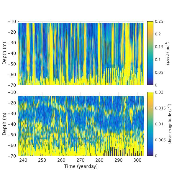 Time-series plots for AOFB 30 ADCP: speed relative to moving ice (top panel) and magnitude of vector shear (bottom panel)