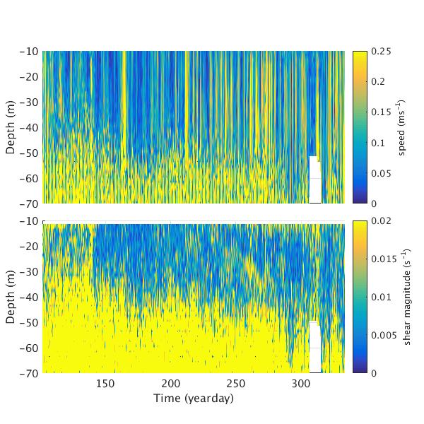 Time-series plots for AOFB 31 ADCP: speed relative to moving ice (top panel) and magnitude of vector shear (bottom panel)