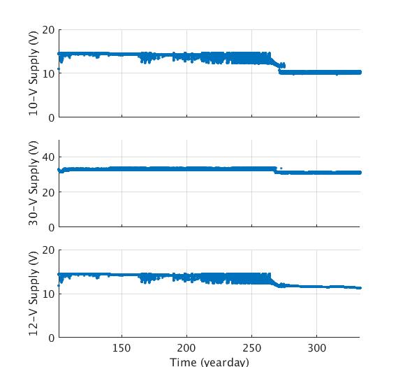 Engineering data plots for AOFB 31: 10-V Supply (top panel), 12-V wind generator battery voltage (second panel) and 40-V Voltage supply (bottom panel)