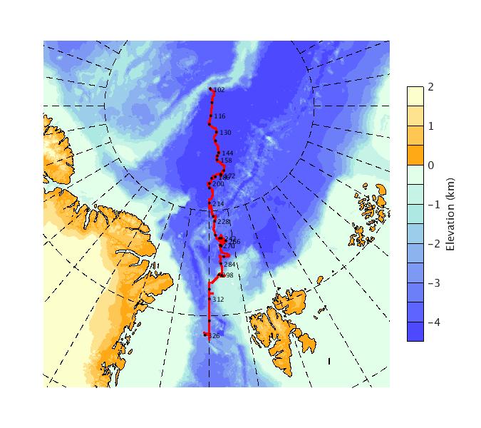 Map of AOFB 31 drift trajectory. Black dots on the map indicate biweekly positions labeled with corresponding yearday values.