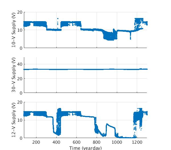 Engineering data plots for AOFB 32: 10-V Supply (top panel), 12-V wind generator battery voltage (second panel) and 40-V Voltage supply (bottom panel)
