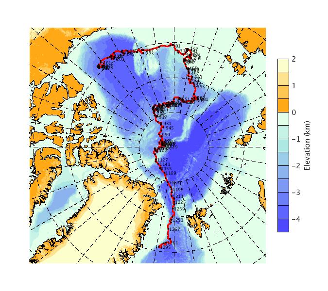 Map of AOFB 32 drift trajectory. Black dots on the map indicate biweekly positions labeled with corresponding yearday values.