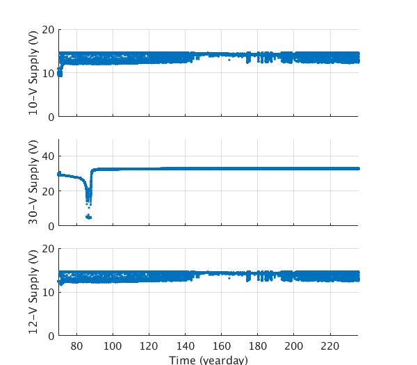 Engineering data plots for AOFB 33: 10-V Supply (top panel), 12-V wind generator battery voltage (second panel) and 40-V Voltage supply (bottom panel)