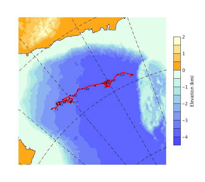 Map of AOFB 33 drift trajectory. Black dots on the map indicate biweekly positions labeled with corresponding yearday values.