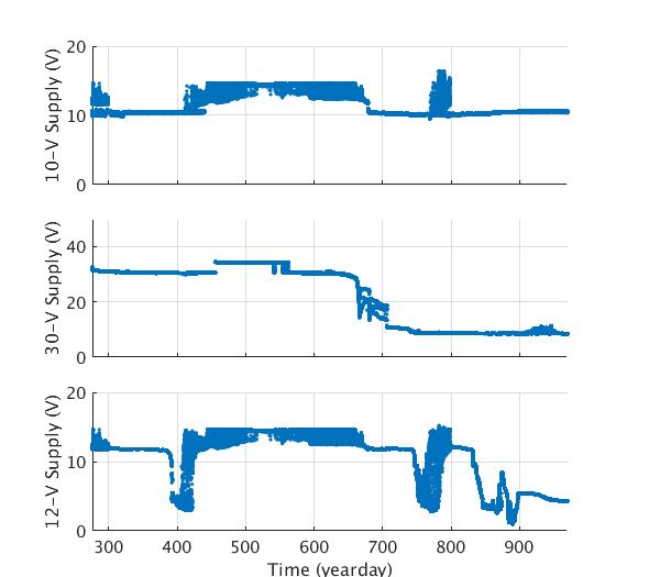 Engineering data plots for AOFB 37: 10-V Supply (top panel), 12-V wind generator battery voltage (second panel) and 40-V Voltage supply (bottom panel)