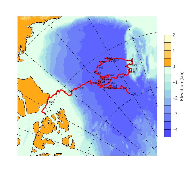 Map of AOFB 37 drift trajectory. Black dots on the map indicate biweekly positions labeled with corresponding yearday values.