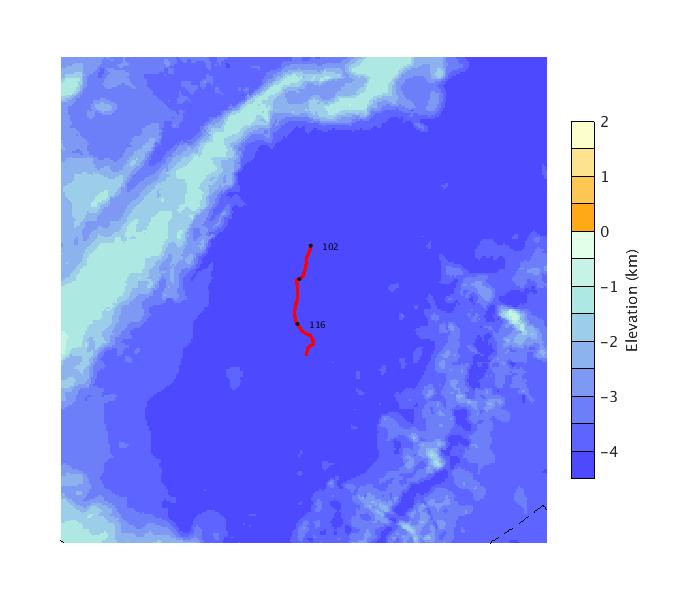 Map of AOFB 38 drift trajectory. Black dots on the map indicate biweekly positions labeled with corresponding yearday values.