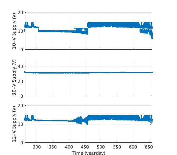 Engineering data plots for AOFB 39: 10-V Supply (top panel), 12-V wind generator battery voltage (second panel) and 40-V Voltage supply (bottom panel)
