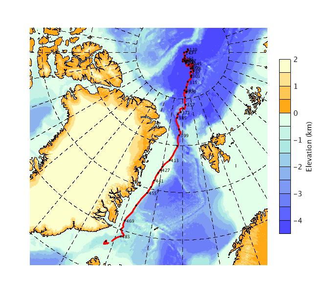 Map of AOFB 3 drift trajectory. Black dots on the map indicate biweekly positions labeled with corresponding yearday values.
