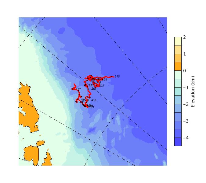 Map of AOFB 40 drift trajectory. Black dots on the map indicate biweekly positions labeled with corresponding yearday values.