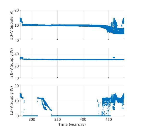 Engineering data plots for AOFB 41: 10-V Supply (top panel), 12-V wind generator battery voltage (second panel) and 40-V Voltage supply (bottom panel)
