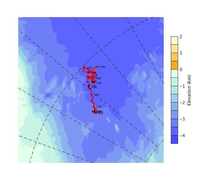 Map of AOFB 41 drift trajectory. Black dots on the map indicate biweekly positions labeled with corresponding yearday values.