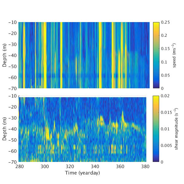 Time-series plots for AOFB 42 ADCP: speed relative to moving ice (top panel) and magnitude of vector shear (bottom panel)