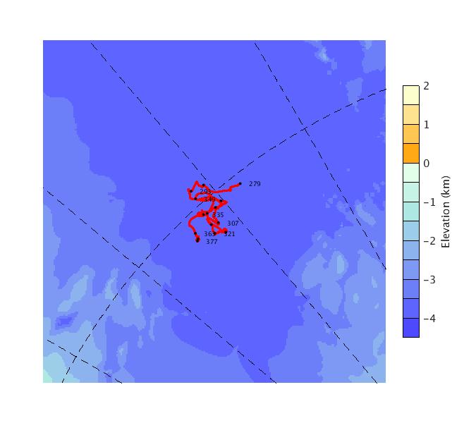 Map of AOFB 42 drift trajectory. Black dots on the map indicate biweekly positions labeled with corresponding yearday values.