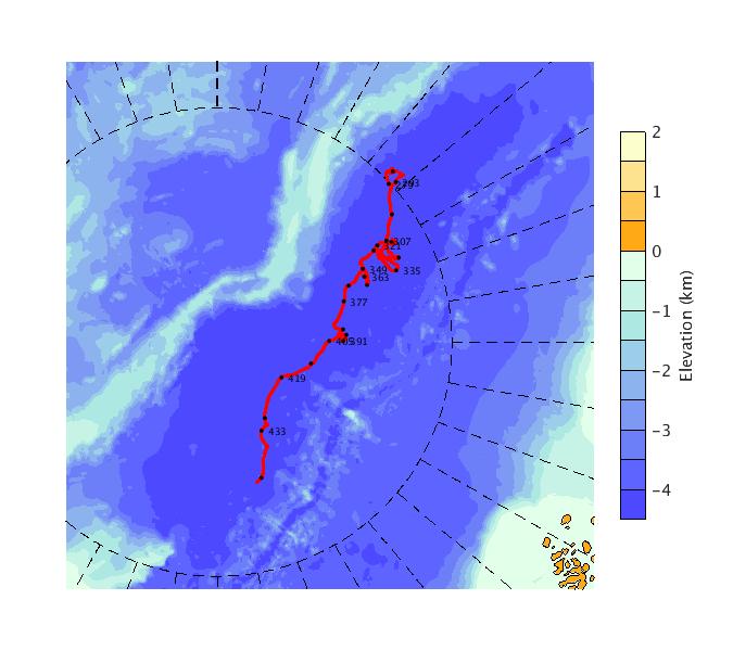 Map of AOFB 43 drift trajectory. Black dots on the map indicate biweekly positions labeled with corresponding yearday values.