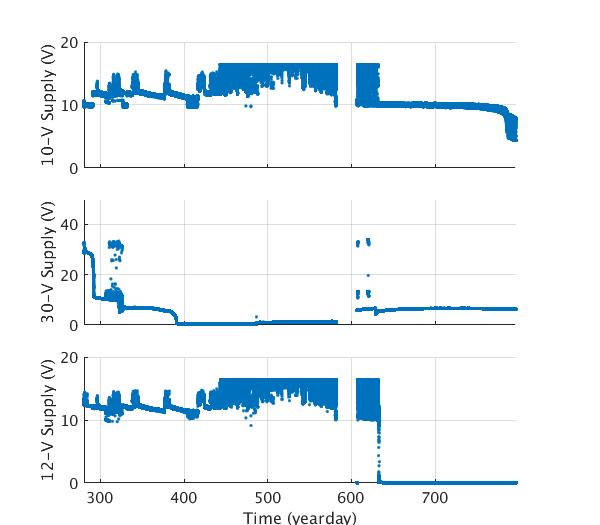 Engineering data plots for AOFB 44: 10-V Supply (top panel), 12-V wind generator battery voltage (second panel) and 40-V Voltage supply (bottom panel)