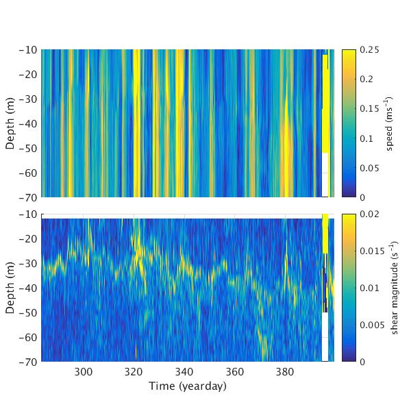 Time-series plots for AOFB 45 ADCP: speed relative to moving ice (top panel) and magnitude of vector shear (bottom panel)