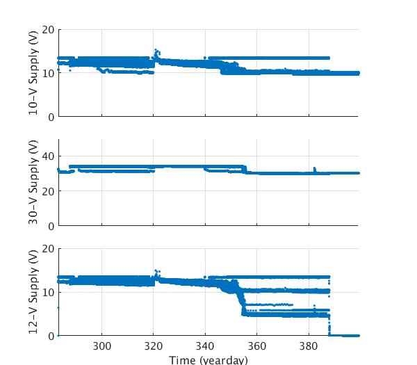 Engineering data plots for AOFB 45: 10-V Supply (top panel), 12-V wind generator battery voltage (second panel) and 40-V Voltage supply (bottom panel)
