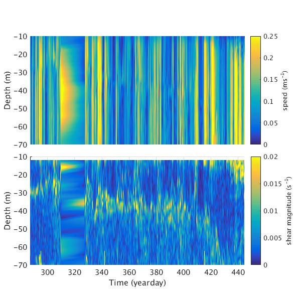 Time-series plots for AOFB 46 ADCP: speed relative to moving ice (top panel) and magnitude of vector shear (bottom panel)