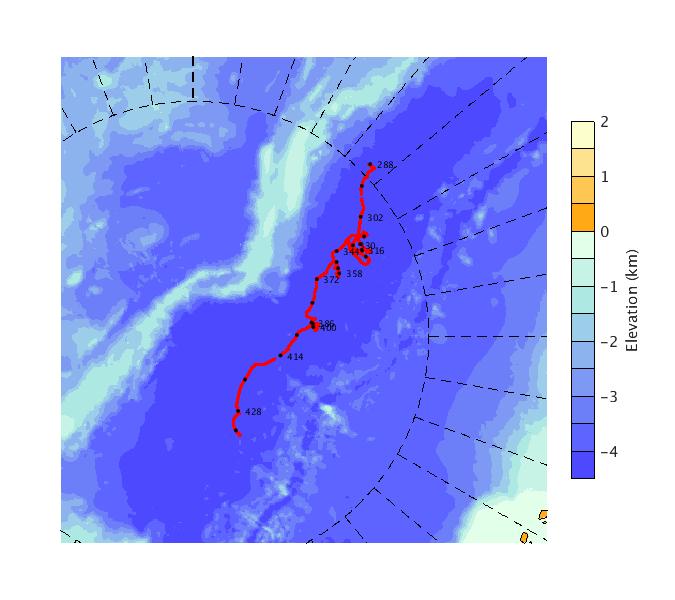 Map of AOFB 46 drift trajectory. Black dots on the map indicate biweekly positions labeled with corresponding yearday values.