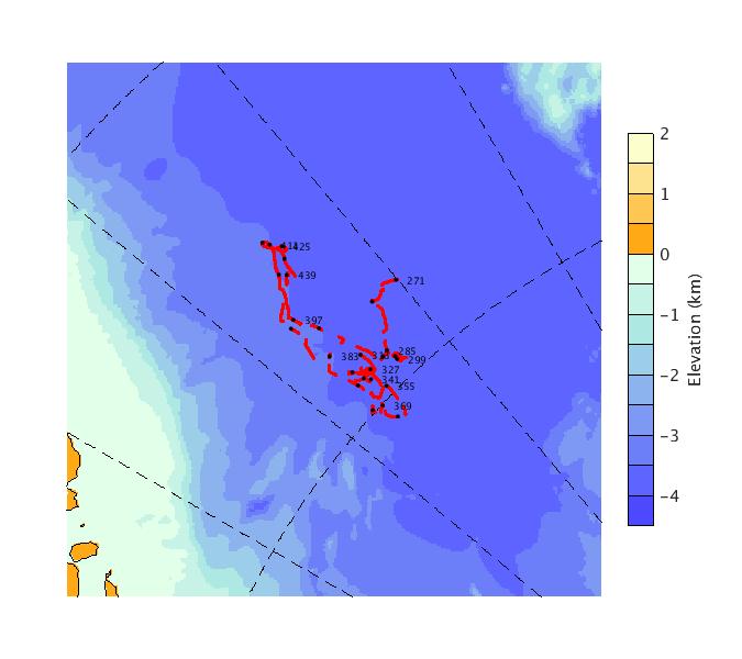 Map of AOFB 47 drift trajectory. Black dots on the map indicate biweekly positions labeled with corresponding yearday values.