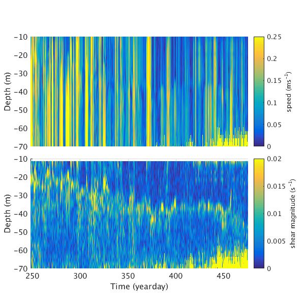 Time-series plots for AOFB 48 ADCP: speed relative to moving ice (top panel) and magnitude of vector shear (bottom panel)