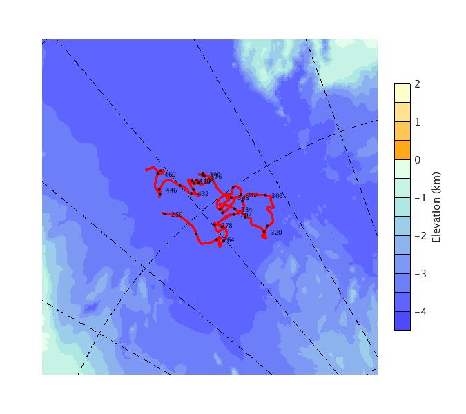Map of AOFB 48 drift trajectory. Black dots on the map indicate biweekly positions labeled with corresponding yearday values.