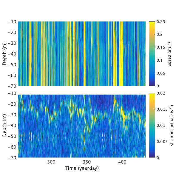 Time-series plots for AOFB 49 ADCP: speed relative to moving ice (top panel) and magnitude of vector shear (bottom panel)