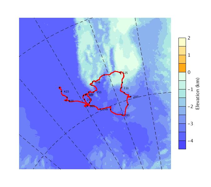 Map of AOFB 49 drift trajectory. Black dots on the map indicate biweekly positions labeled with corresponding yearday values.